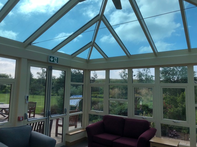 A conservatory we recently completed at Severn Hospice in Shrewsbury. Built in fully thermally broken aluminium, coloured in a relaxing Ral 1015 light ivory. The roof has two electrically operated vents for natural ventilation, utilizing temperature and rain sensors for fully automatic or manual operation. The large area of glazing on three sides give panoramic views of the beautiful garden area. The double doors give nice easy access in and out of the building.